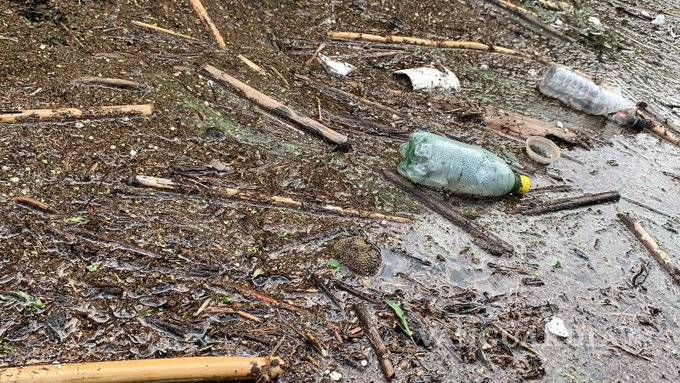 Videos y fotografías muestran al cuerpo de agua completamente lleno de basura, principalmente botellas de plástico, latas y recipientes.