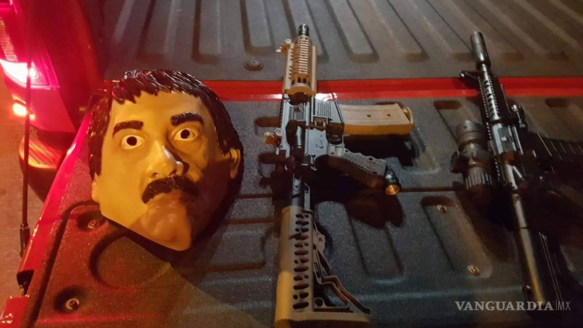 La Secretaría de Seguridad Pública informó que los jóvenes portaban máscaras de Joaquín ‘El Chapo’ Guzmán, además traían réplicas de armas cortas y largas