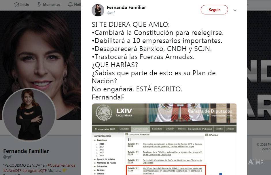 La comunicadora Fernanda Familiar, quien en más de una ocasión ha demostrado ser una crítica del presidente electo, Andrés Manuel López Obrador, ayer lanzó un mensaje en Twitter en el cual destacaba varios puntos que AMLO tiene en su Plan de Nación.