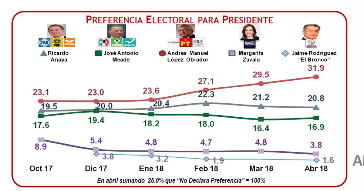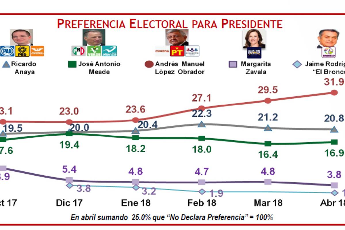 Un día después de la publicación más reciente sobre preferencias presidenciales que encabezaba Andrés Manuel López de Obrador, y a dos semanas del inicio de las campañas, este jueves el candidato de Morena lidera las preferencias electorales con 32 por ciento.