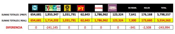 La suma hecha “a mano”, resultado por resultado, arroja que el PRI en realidad tuvo 28 mil 252 votos, y no los 29 mil 196 votos que aparecen sumados por el software del Programa de Resultados Electorales Preliminares.