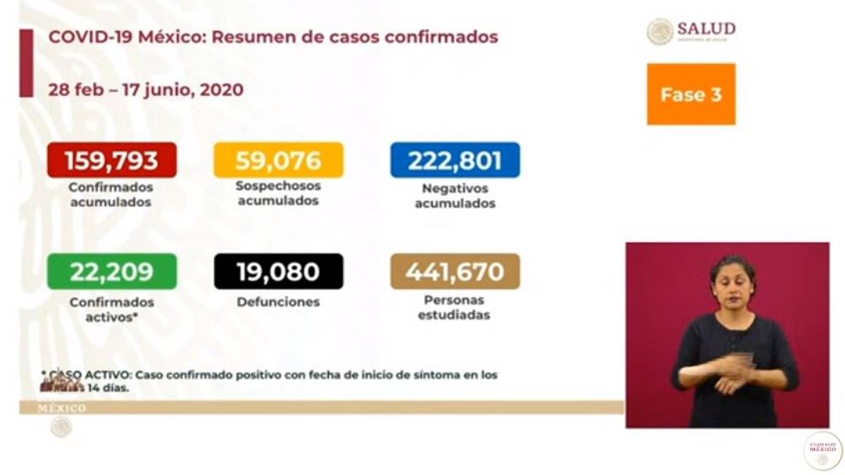 En el último reporte, del 16 de junio, fueron confirmados 154 mil 853 casos positivos, 21 mil 159 activos y 18 mil 310 defunciones.