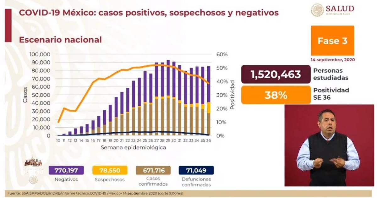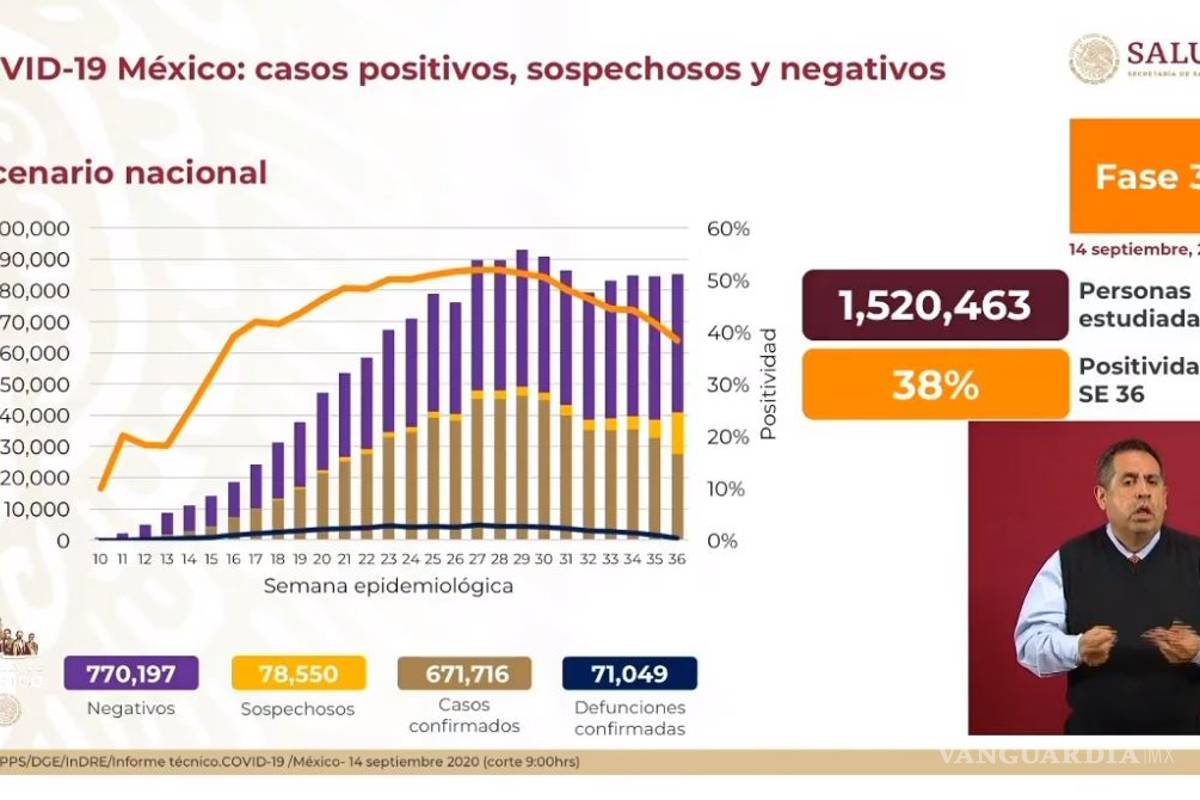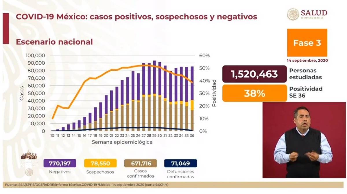 En el último reporte, del 13 de septiembre, fueron confirmados 668 mil 381 casos positivos y 70 mil 821 defunciones.