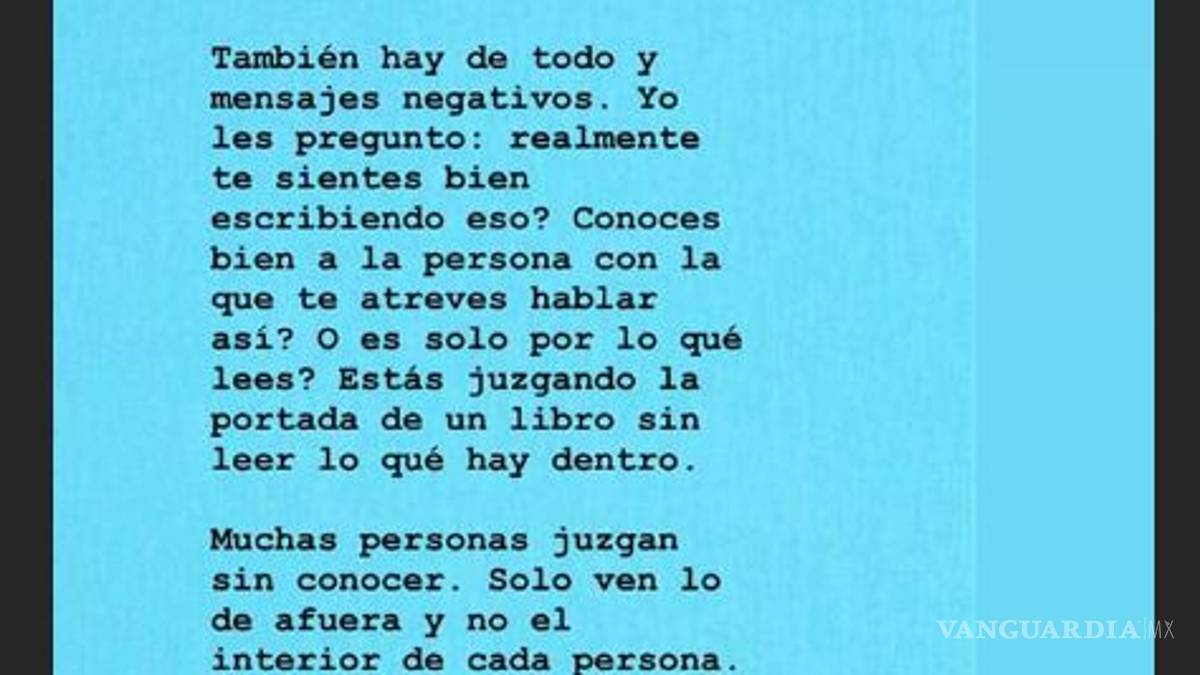 Y añadió: "También hay de todo y mensajes negativos. Yo les pregunto: ¿realmente te sientes bien escribiendo eso? Conoces bien a la persona con la que te atreves a hablar así? ¿O es sólo por lo que lees? Estás juzgando la portada de un libro sin leer lo que hay dentro", expresó la modelo.