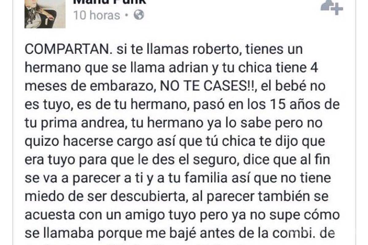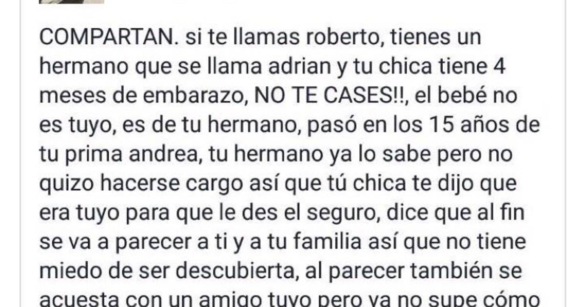Un mensaje publicado en Facebook ha comenzado a viralizarse, ya que llama a un sujeto, de nombre Roberto, a cancelar una próxima boda con su novia, ya que, según dice el mensaje, ella está embarazada, pero del hermano de Roberto, de nombre Adrián