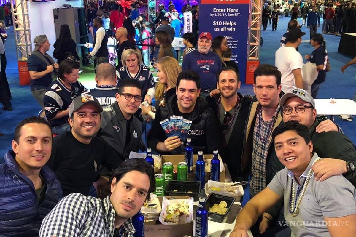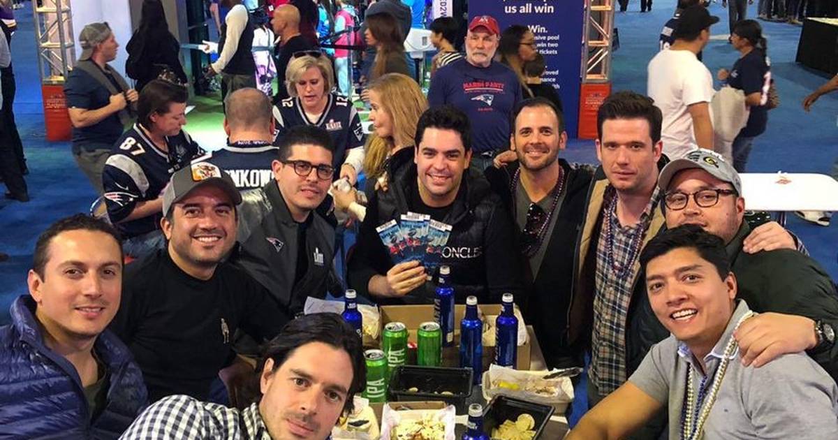 El alcalde, que lleva una gorra de "Patriotas", está en compañía de 8 personas y uno de sus amigos sostiene los boletos para ingresar a la final de la NFL que se realizó el domingo 3 de febrero.