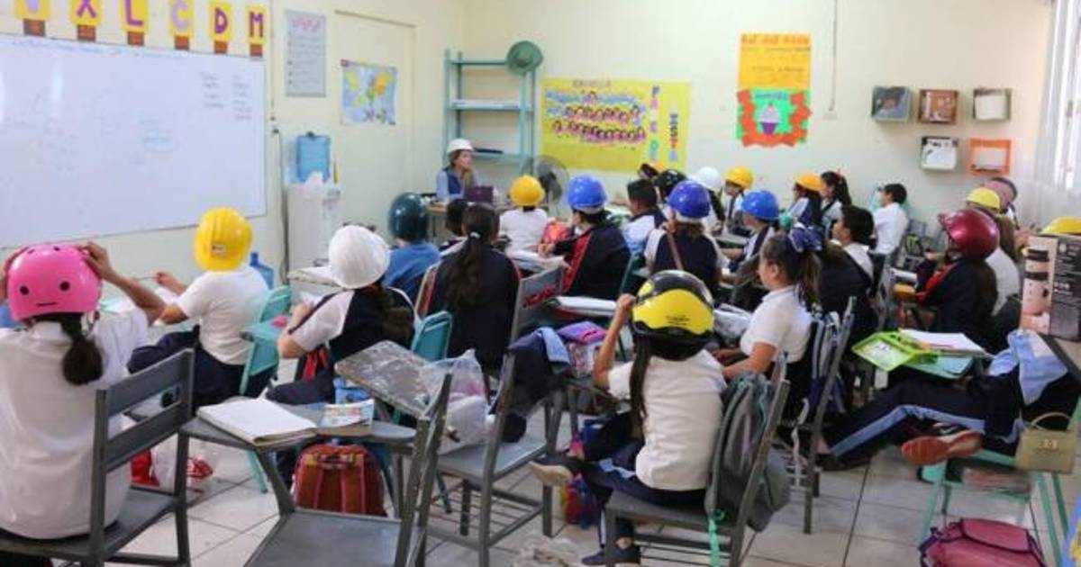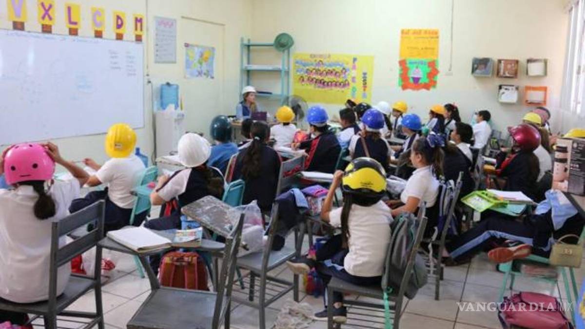 Alumnos del plantel educativo “María Elvira Delgado Calderón”, de la ciudad de Los Mochis, asisten a clases con cascos ante el temor de sufrir algún accidente por los desprendimientos de materiales de construcción de los techos.