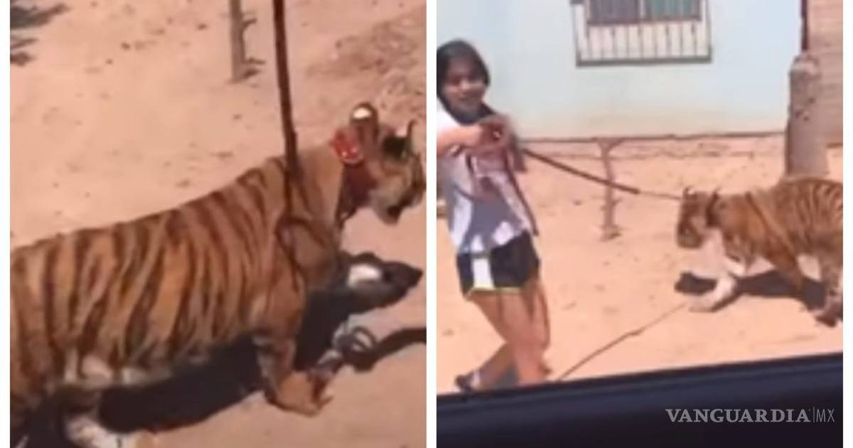 Una adolescente fue captada en un video, viralizado en redes sociales, paseando a un tigre de bengala con una correa en su cuello, en el municipio de Guasave.