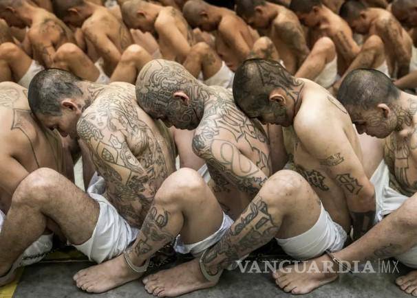 Dentro de la prisión, los hombres tatuados, con pantalones cortos blancos, descalzos y esposados, se acurrucan mientras se agachan y cuelgan sus cabezas rapadas antes de correr hacia las celdas de la cárcel.