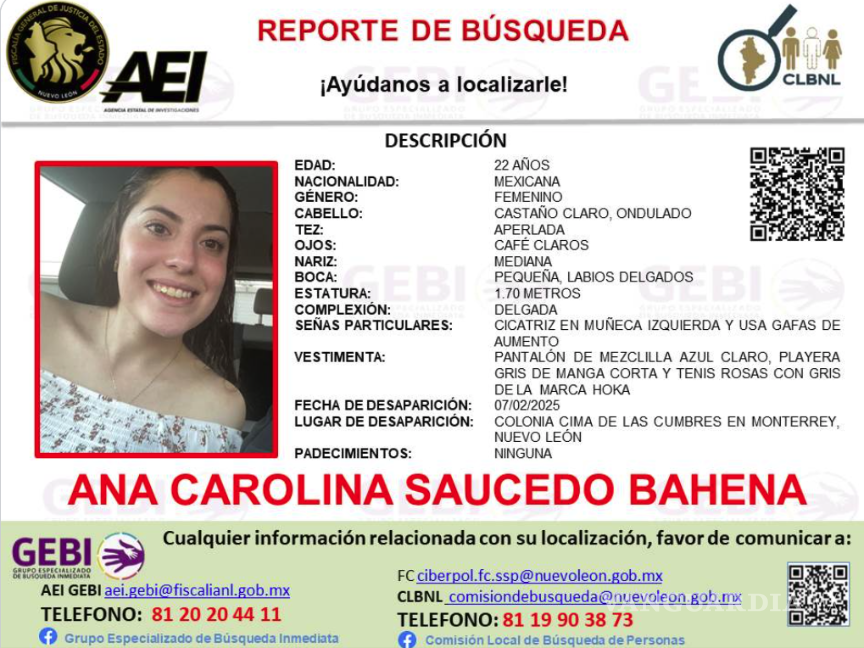 Las autoridades piden llamar al 81 20 20 44 11, si alguien tiene información respecto al paradero de Ana.