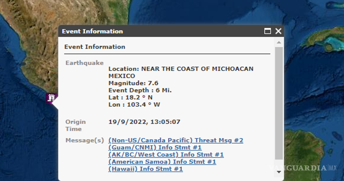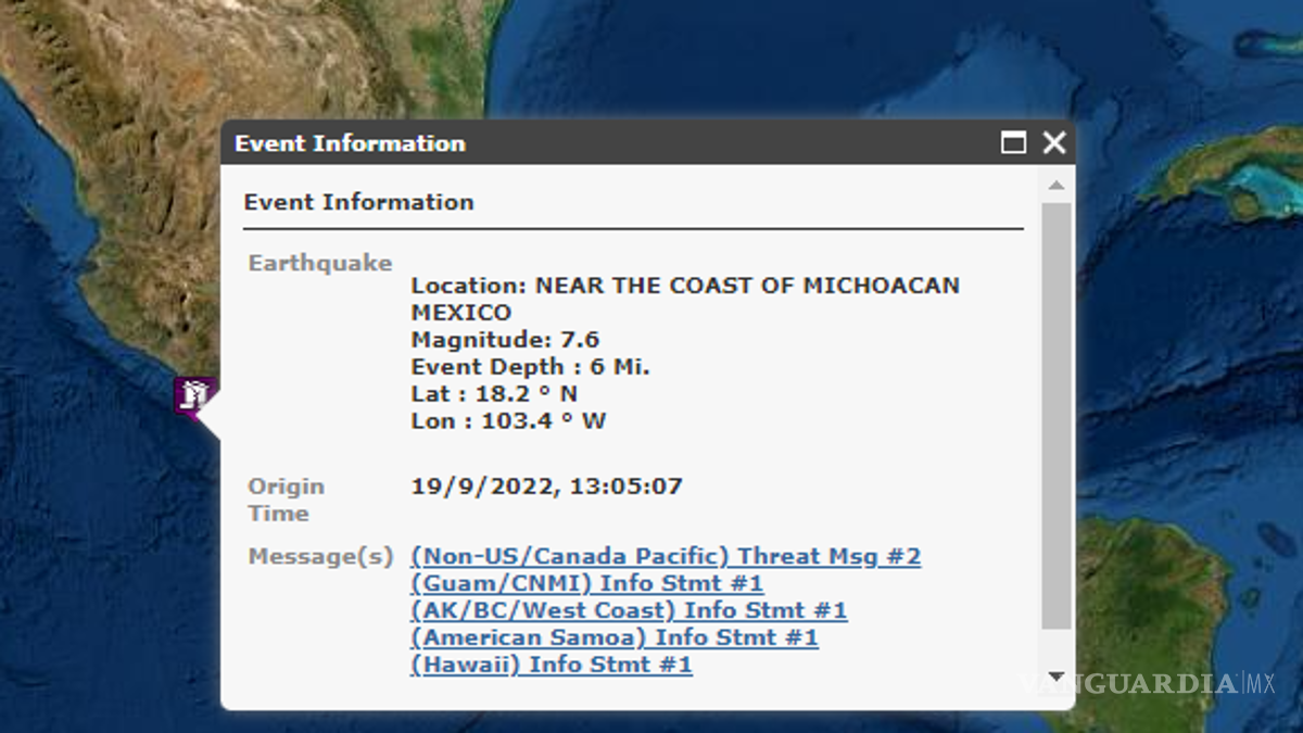 De acuerdo con el Tsunami Warning Center de Estados Unidos, actualmente existe amenaza de tsunami para las costas de Michoacán y Colima, luego del terremoto magnitud 7.4 que sacudió a algunos estados del país.