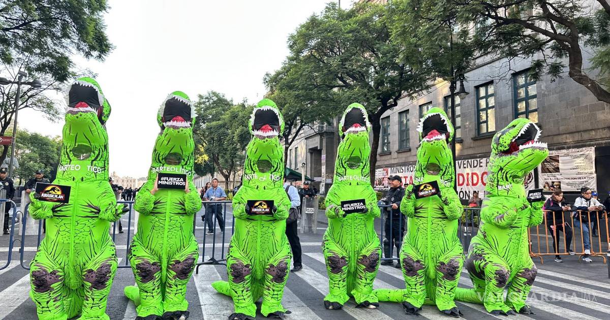 CDMX.- En las inmediaciones de Palacio Nacional y la Suprema Corte de Justicia de la Nación (SCJN), donde se discute el Plan B de la reforma electoral, se observó un grupo de botargas de dinosaurios para pedir a los ministros su anulación.