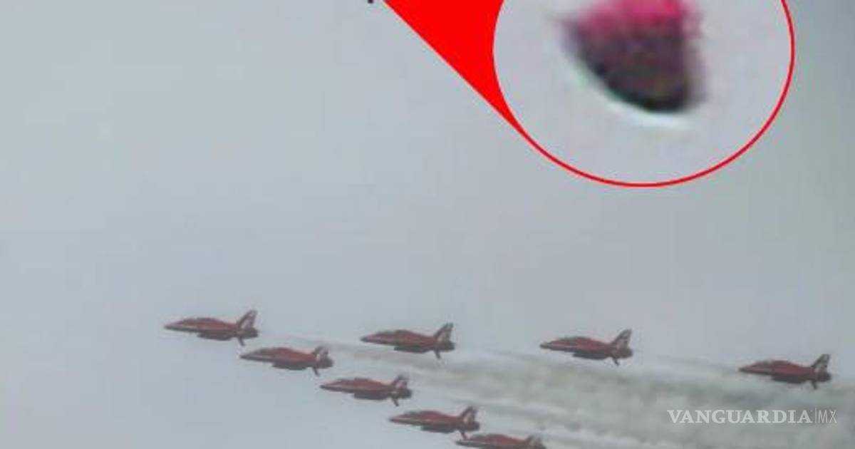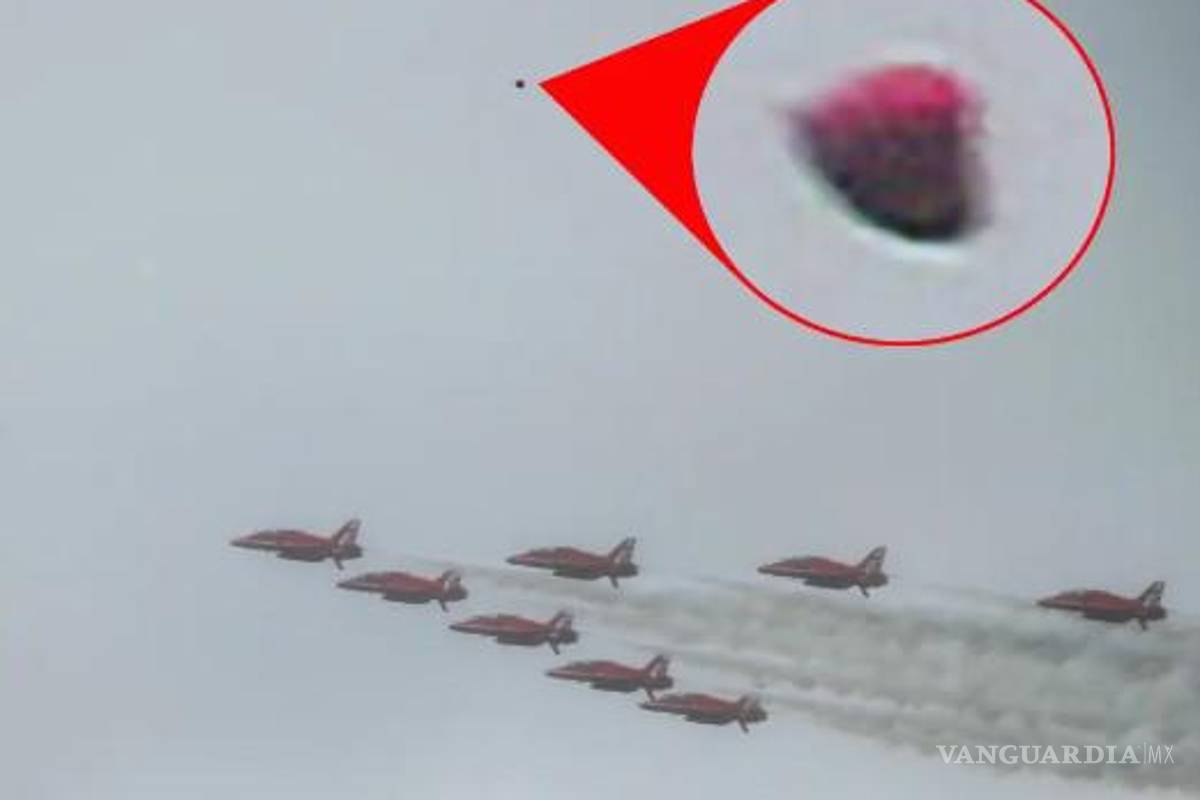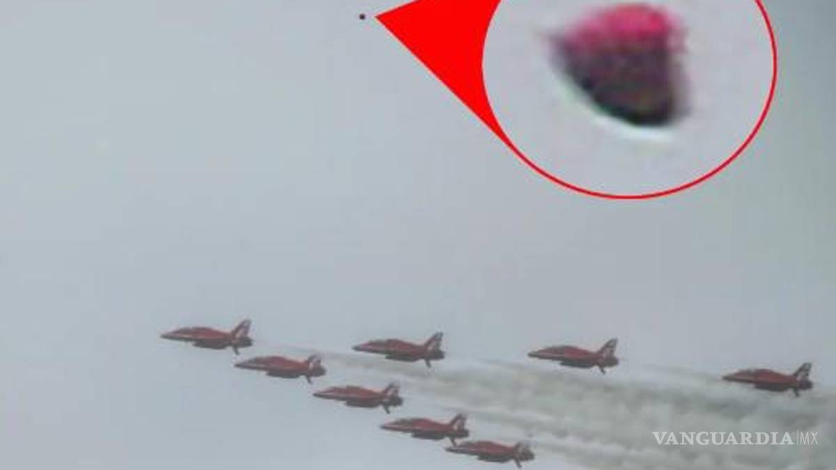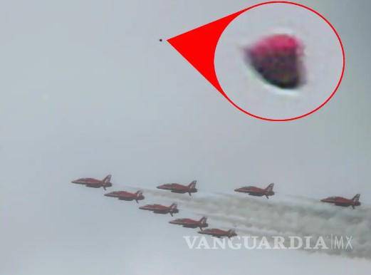 Un fotógrafo que capturó el evento histórico afirma haber tomado imágenes de un OVNI, que se vio en el fondo de los aviones Red Arrow de la Royal Air Force haciendo un sobrevuelo de Londres nublado, según el Mirror.