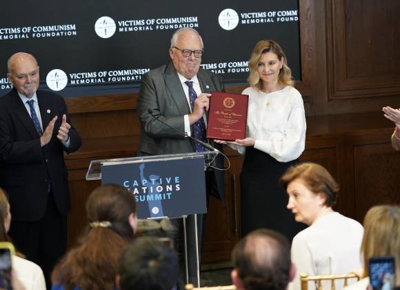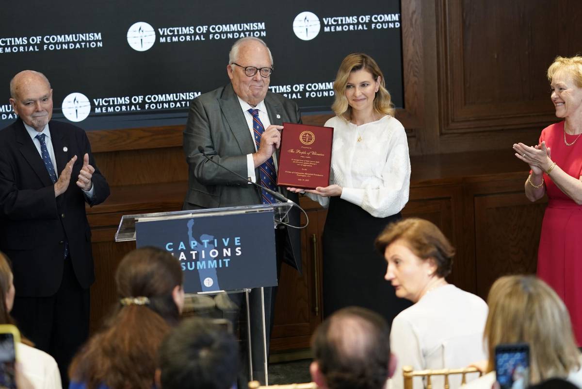 La Fundación en Memoria de las Víctimas del Comunismo otorgó al pueblo ucraniano su Premio a los Derechos Humanos de los Disidentes. Zelenska recibió el premio durante una visita a Washington que realiza esta semana.