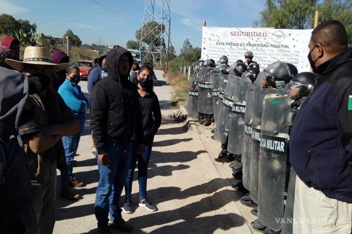 TEPETLAOXTOC, EDOMEX.- Una veintena de escudos, con otros tantos agentes vestidos de táctico militar, armados con sus macanas, protegen la entrada de las obras del cuartel de la Guardia Nacional en Tepetlaoxtoc al oriente del Estado de México. Frente a ellos, medio centenar de vecinos de la zona que se oponen a su instalación en este predio en concreto, el único espacio verde y deportivo del municipio. Atrás, dos elementos más observan con sus amenazantes fusiles Xiuhcóatl en posición de descanso.