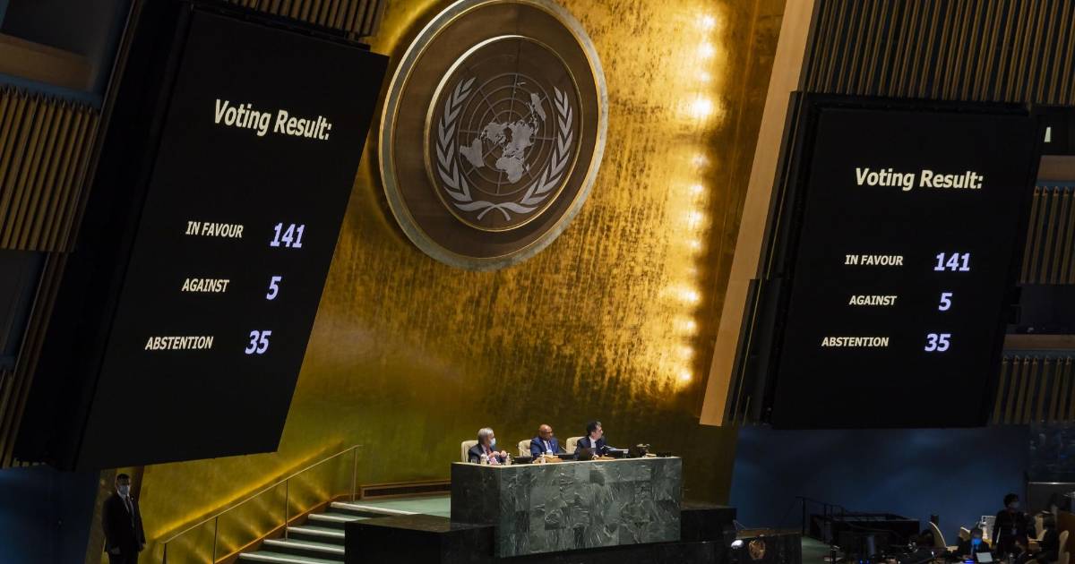 La votación sobre la resolución, titulada “Agresión contra Ucrania”, fue de 141 votos a favor, 5 en contra y 35 abstenciones.