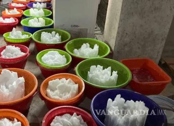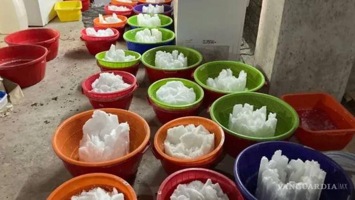 En las fotografías, compartidas por la propia Sedena, se puede observar la metanfetamina empacada en contenedores, bolsas de plástico y hieleras.
