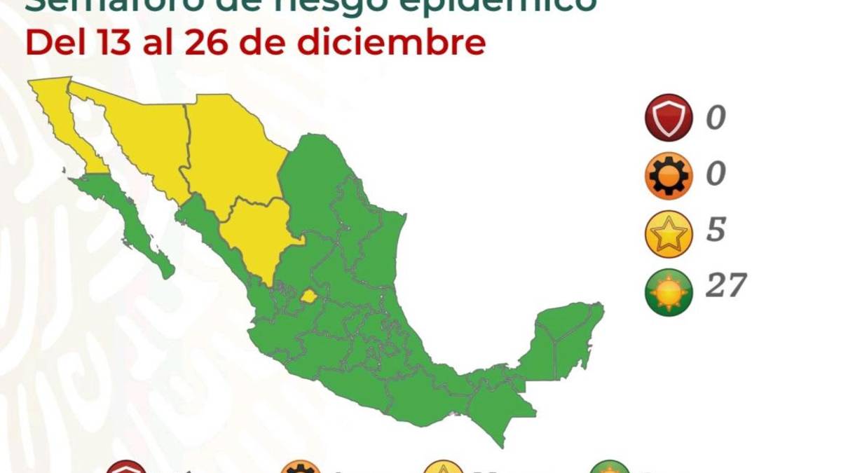 La Secretaría de Salud dio a conocer este viernes el estado de su semáforo epidemiológico COVID-19 que prevalecerá en México del lunes 13 al domingo 26 de diciembre.