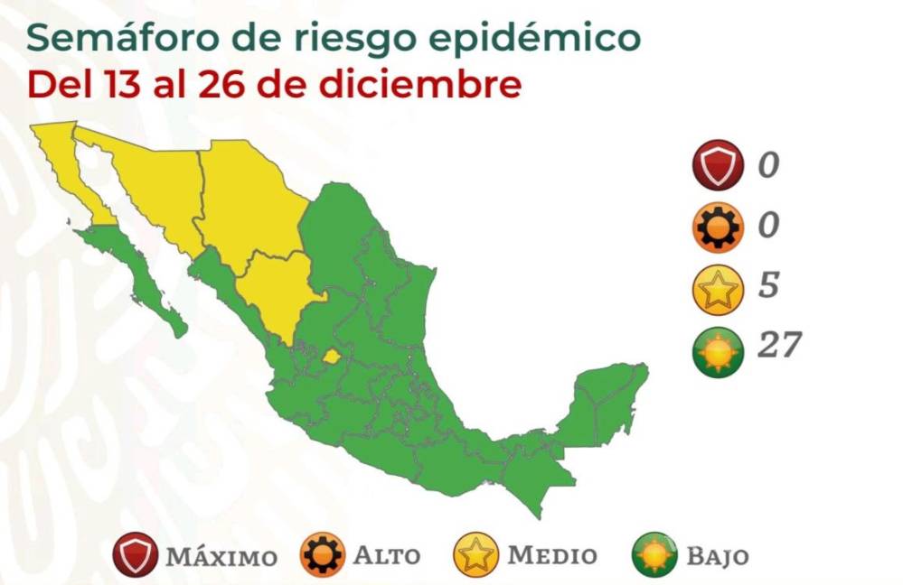 De acuerdo al informe de la dependencia, 27 estados estarán en color verde y 5 en amarillo por los siguientes 15 días, siendo los del norte los que se pueden ver con un poco más de riesgo de acuerdo a Salud Federal.