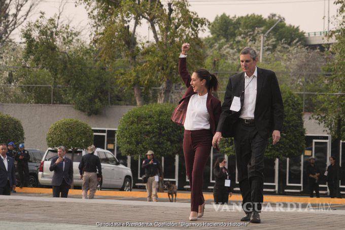 La candidata de la coalición integrada por Morena, Verde y PT, llegó a las instalaciones donde se realizará el primer debate presidencial de la mano de su esposo Jesús María Tarriba Unger, mientras que parte de sus invitados le coreaban “¡Presidenta, presidenta!”.