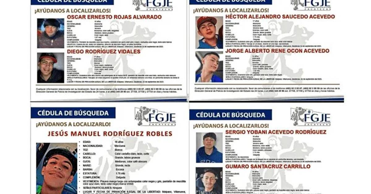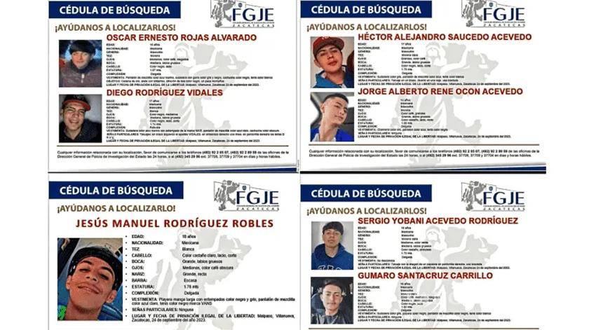 De acuerdo a las cédulas de búsqueda que ha difundido la Fiscalía de Zacatecas el más joven es Jorge Alberto Rene Ocón Acevedo, de 14 años de edad; le sigue Oscar Ernesto Rojas Alvarado, de 15 años; así como Diego Rodríguez Vidales y Héctor Alejandro Saucedo Acevedo, ambos de 17 años.