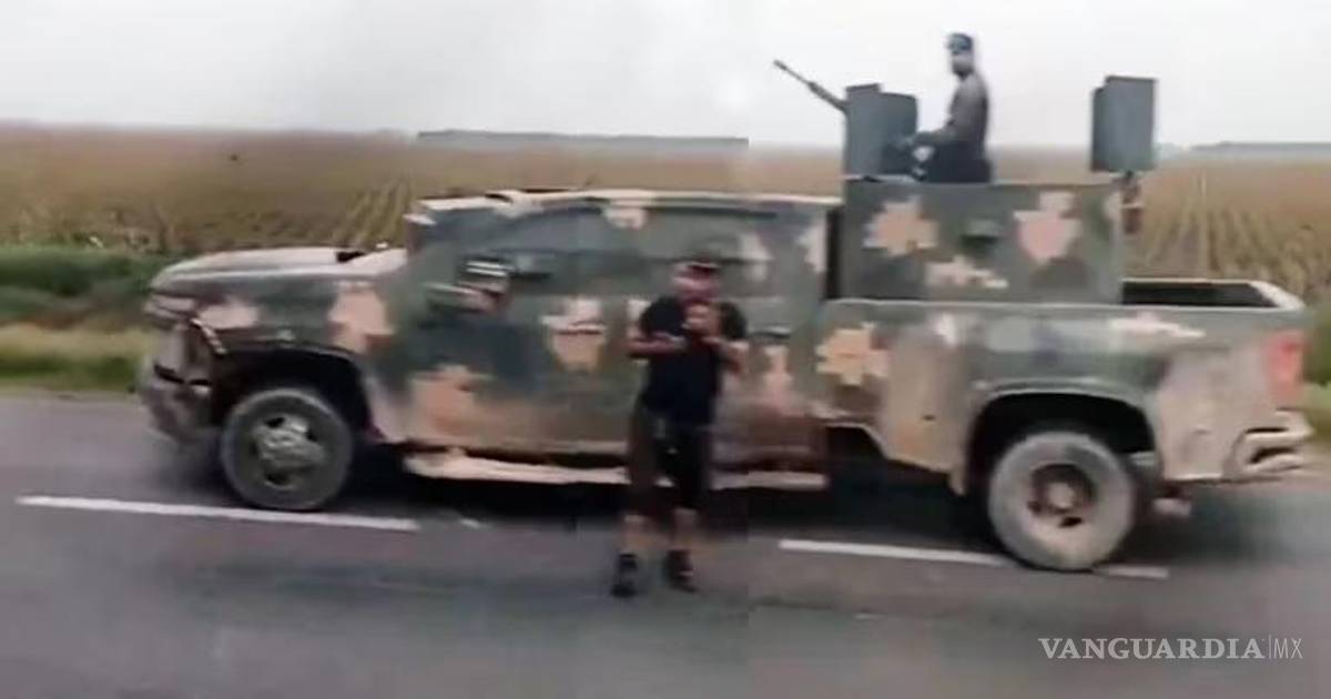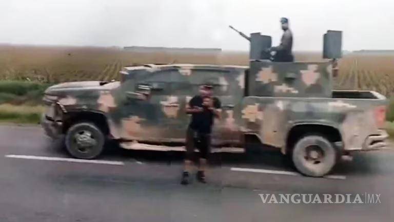 En las grabación, que dura 13 segundos, muestra el momento en que una camioneta modificada con blindaje artesanal y con camuflaje tipo militar, se encuentra sobre la carretera, mientras que una persona con un celular se encuentra a un lado, todo ello mientras otra persona arriba de la unidad vigila con una arma de gruso calibre.