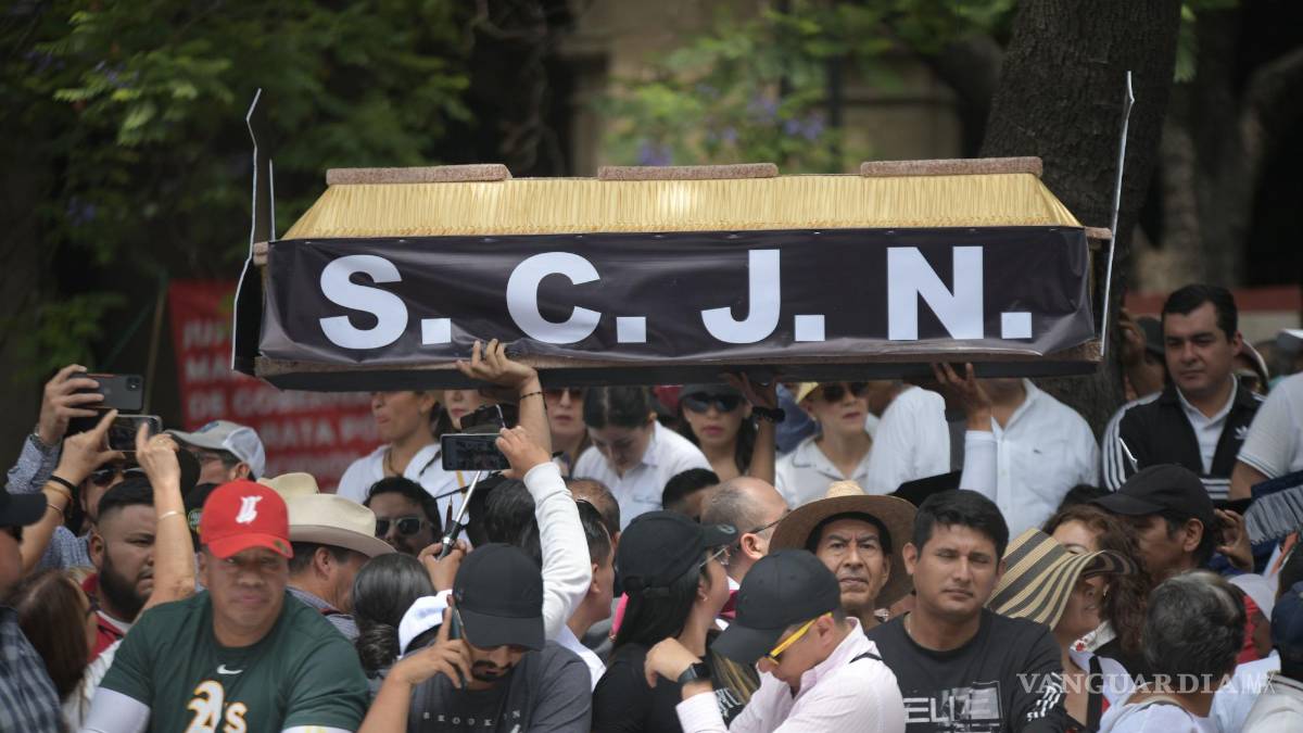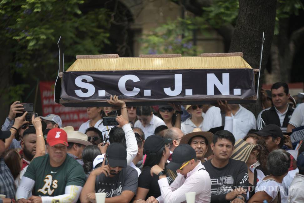 Con toga, birrete y portando lentes oscuros, un grupo de jóvenes morenistas ingresaron al Centro Histórico con al menos dos ataúdes decorados con las siglas de la Suprema Corte y la foto de los ministros.