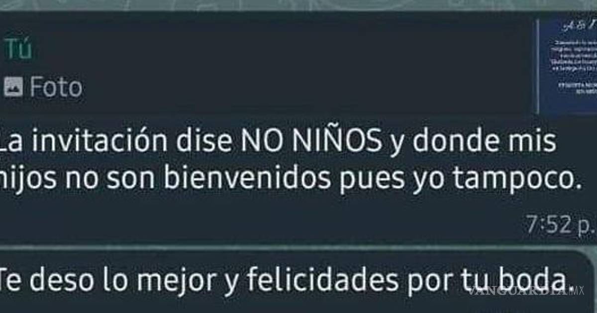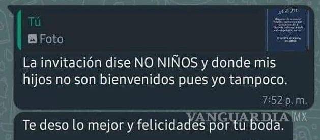 Una captura de pantalla que comparte la conversación entre dos personas ocasionó el debate debido a que una de ellas le envió la invitación para su boda, sin embargo, en ella se podía leer “sin niños”, situación que levantó opiniones encontradas entre los internautas.