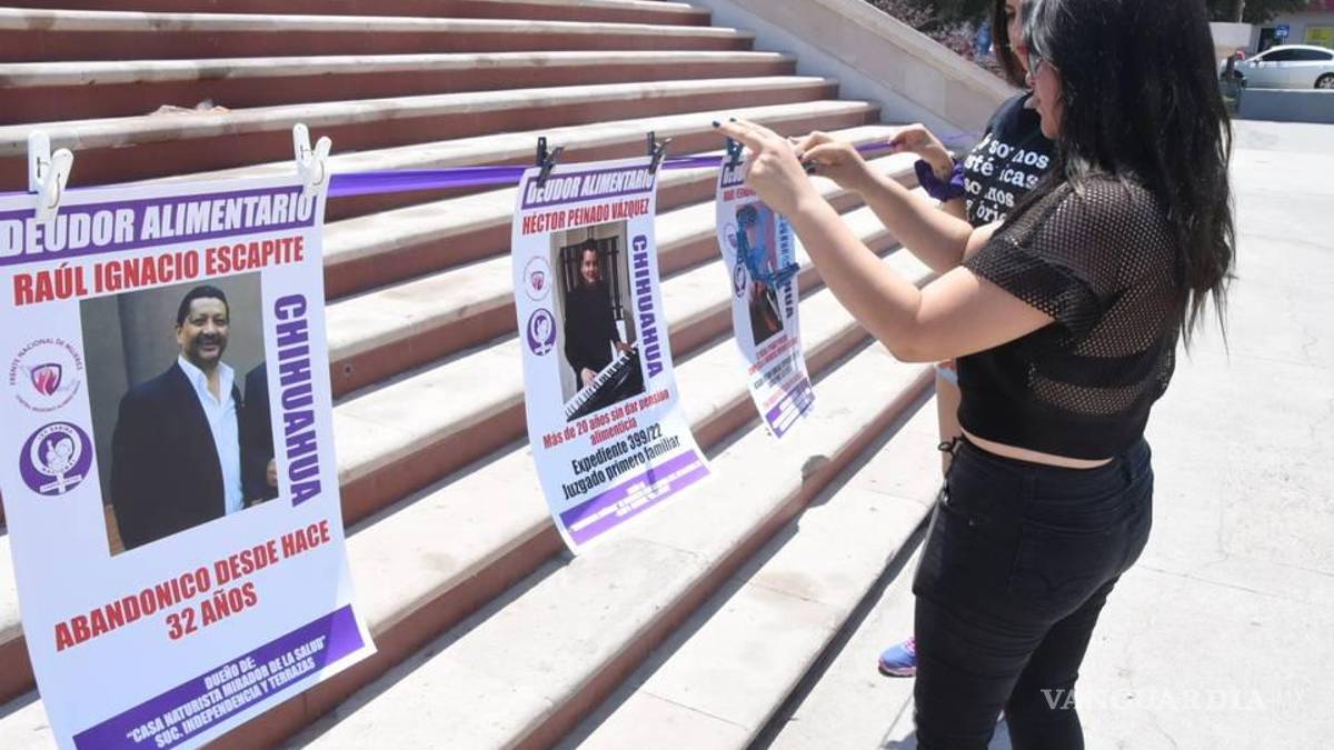 En la Ciudad de México, frente a Palacio Nacional, integrantes del colectivo Ley Sabina colocaron pancartas con los nombres, fotografías y datos de hombres, principalmente, que no aportan a la crianza de sus hijas e hijos.