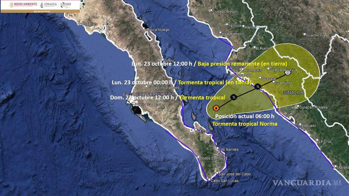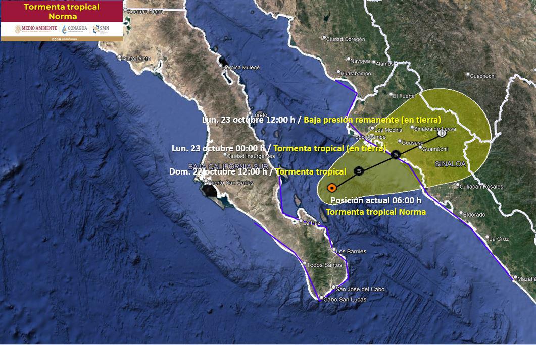 La Tormenta Tropical “Norma” sigue impactando a las costas mexicanas del Océano Pacífico, por lo que de acuerdo con el Servicio Meteorológico Nacional (SMN) de la Comisión Nacional del Agua (Conagua), durante este domingo 22 de octubre el centro del ciclón impactará en las costas al norte de Sinaloa durante la tarde-noche del día de hoy.