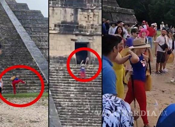 A través de redes sociales se difundieron videos, este lunes 21 de noviembre, en los que se ve a la mujer, quien iba acompañada de un hombre, cuando burla los cordones de seguridad y comienza a subir por las escaleras de la pirámide.