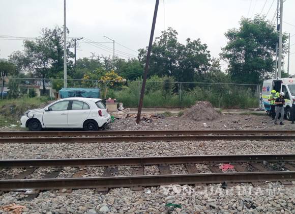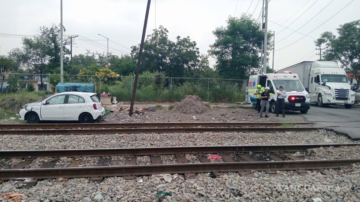Tren arrastra 10 metros auto y conductor sale ileso, en Monterrey