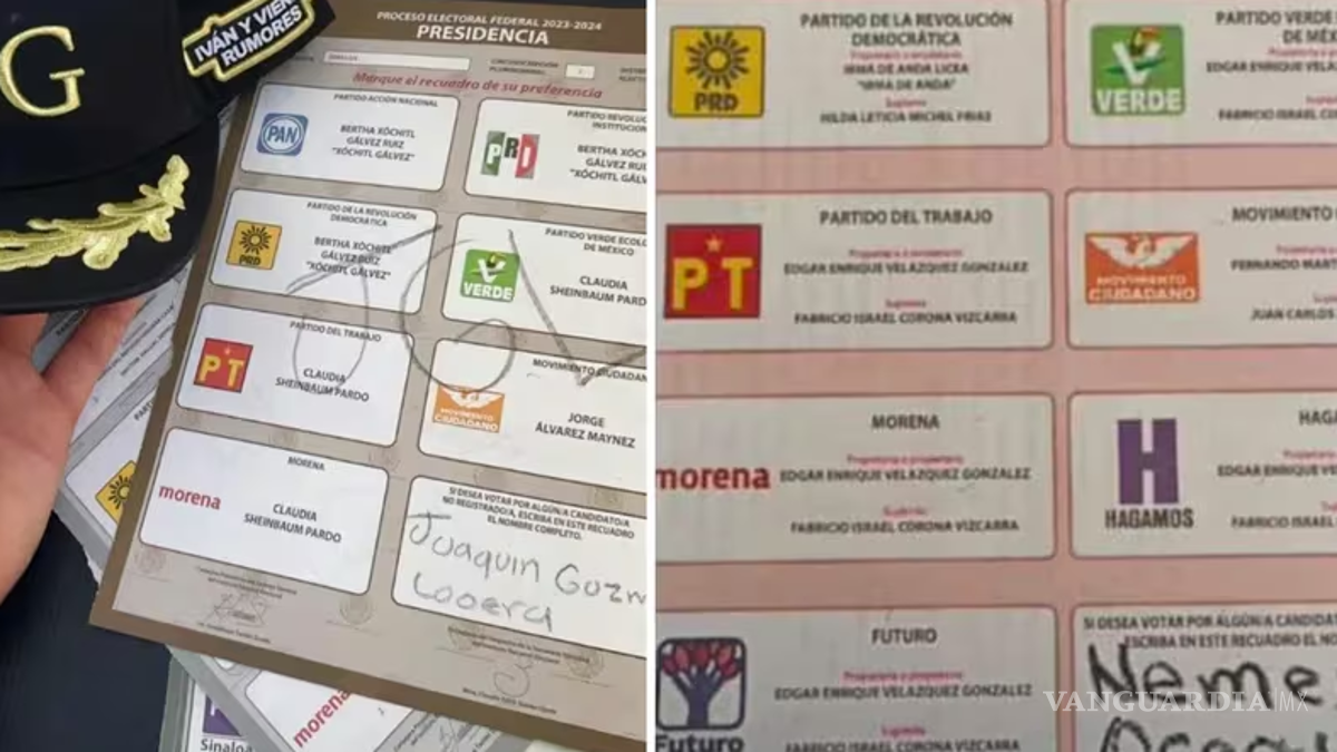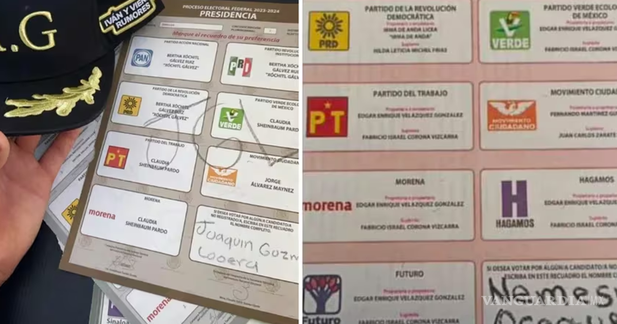 En una de las fotografías se aprecian las siglas “JGL” escritas en el centro de la papeleta para la Presidencia de la República, así como el nombre de Joaquín Guzmán Loera —condenado a cadena perpetua en Estados Unidos— en el recuadro destinado a las candidaturas no registradas.