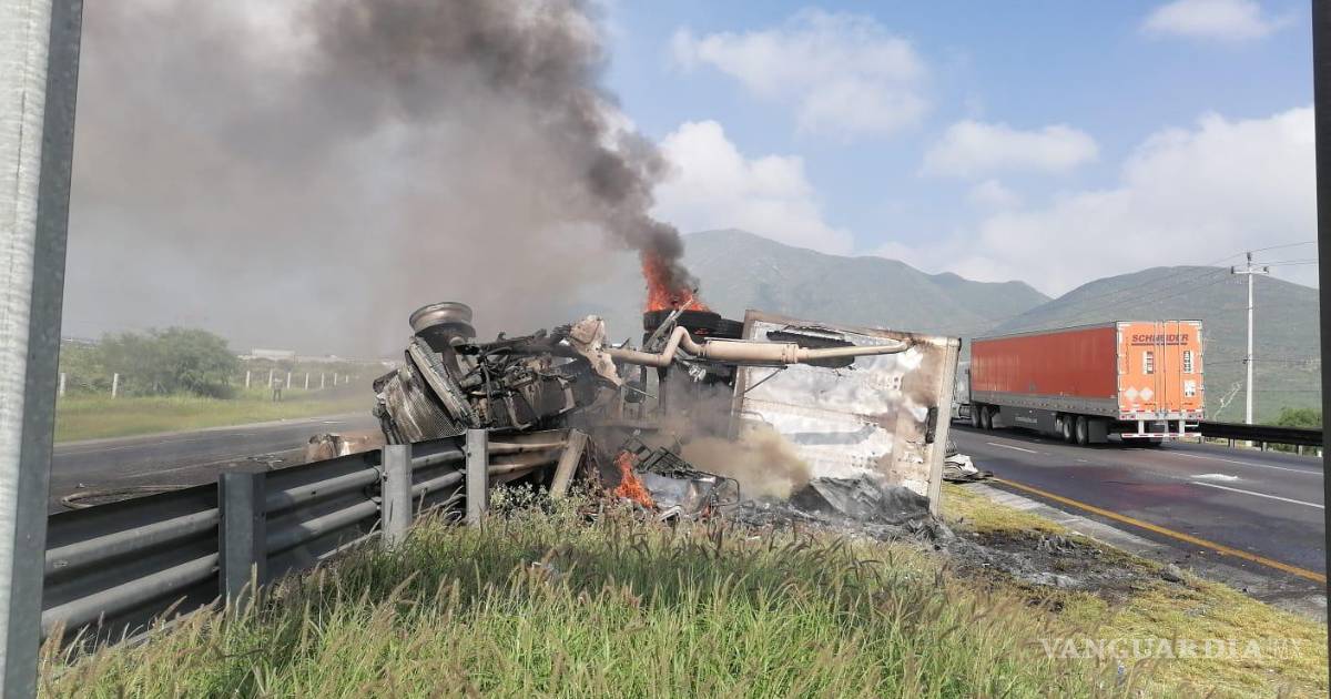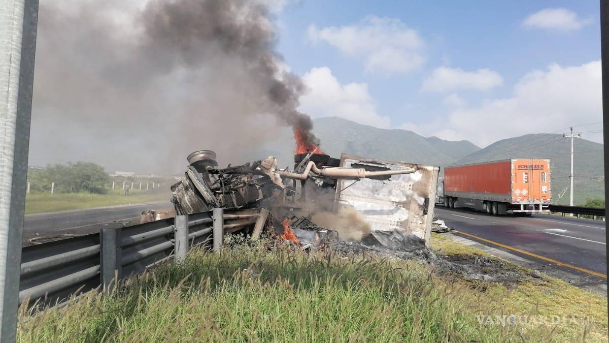Vuelca y se incendia tráiler en la carretera Saltillo- Monterrey