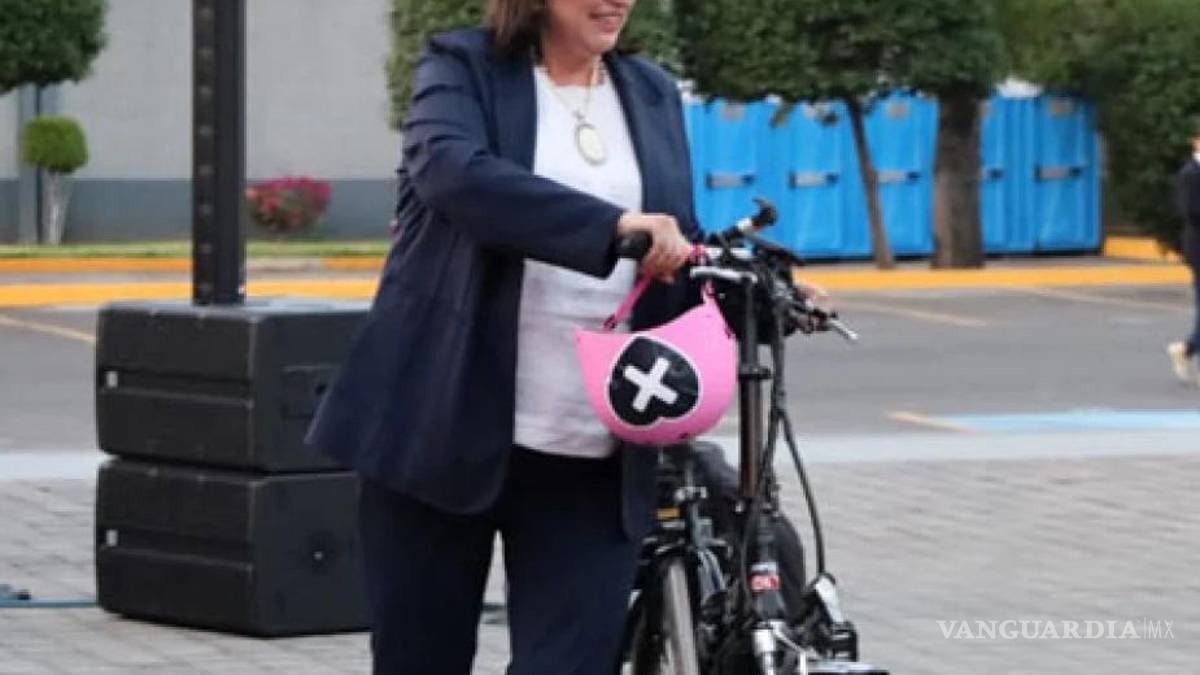 Xóchitl Gálvez llegó al debate en el INE en bicicleta