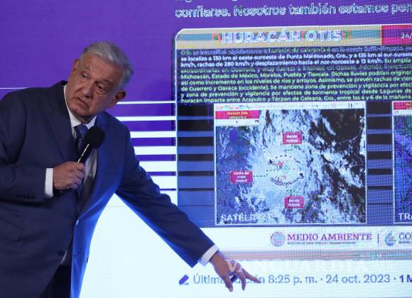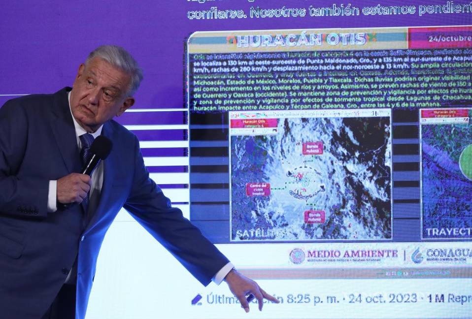 8:06 p.m. Primer aviso del presidente López Obrador sobre el huracán. En un tuit pide a la población “trasladarse a refugios, mantenerse en lugares seguros: alejados de ríos, arroyos, barrancas y estén alerta, sin confiarse”. Este primer aviso del Presidente sucede 28 horas después de que se dio la primera “alerta temprana de huracán” en Estados Unidos y 18 horas después de que el Meteorológico Nacional pronosticó que Otis se convertiría en huracán. En este momento ya era categoría 4, en Acapulco era de noche y se sentían vientos de 200 kms/hr.