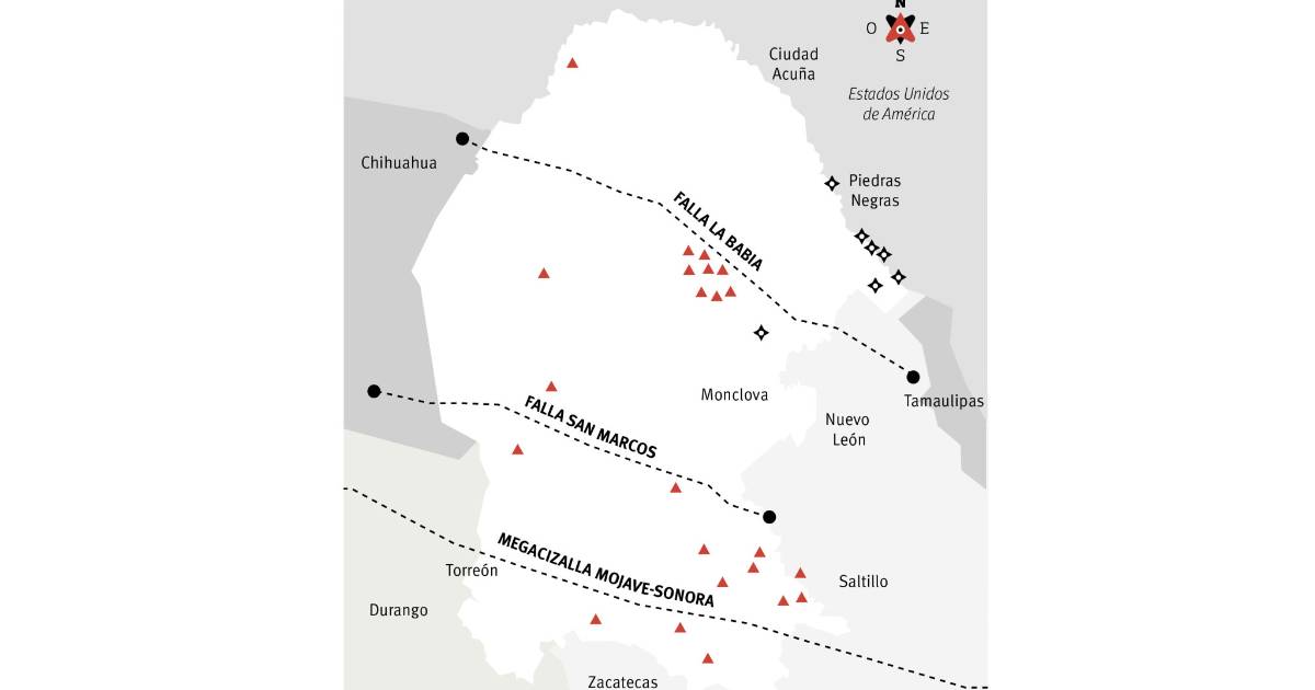 Coahuila, como el resto del País, no está libre de sismos, sólo que estos son poco frecuentes y de baja intensidad. Estudios sobre historia sismológica de México muestran evidencia de temblores en el estado desde hace más de 170 años. De 1841 hacia acá se tiene registro de 48 sismos, todos asociados con su cercanía a tres grandes lineamientos de fallas que atraviesan la entidad: Falla de la Babia, Falla de San Marcos y la Megacizalla Mojave-Sonora, y un número importante vinculado a la actividad minera en la Región Carbonífera, como se puede apreciar en el siguiente mapa.