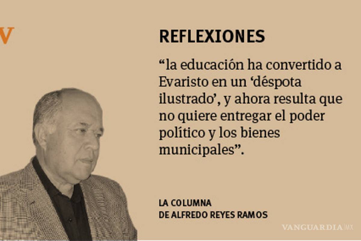 Todos esos logros sin contar con alguna educación, pues sepa usted que Evaristo recién ha terminado la primaria en el IEEA, algo que en verdad aplaudimos, pero que ha resultado de muy nocivas consecuencias para el pueblo de Parras, ya que la educación ha convertido a Evaristo en un “déspota ilustrado”, y ahora resulta que no quiere entregar el poder político y los bienes municipales.