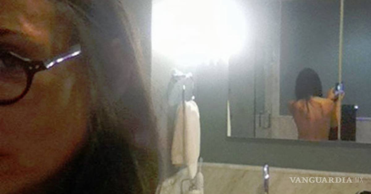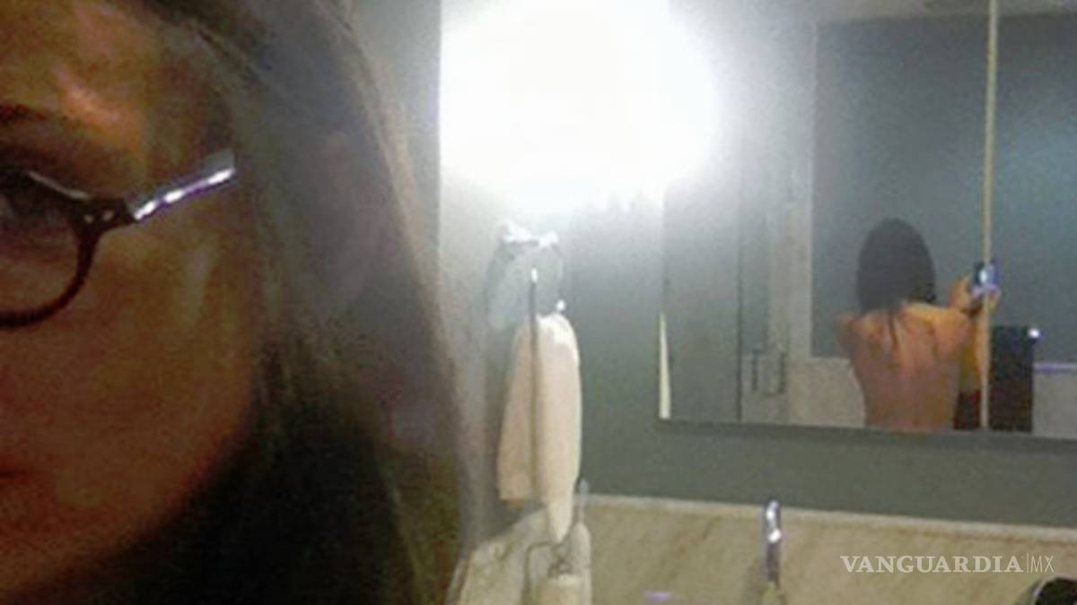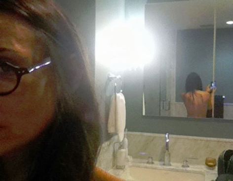 La esposa de Ashton Kutcher, de 33, aparece en un baño, con gafas oscuras y su cabellera larga y negra, dándole la espalda descubierta a un espejo de su casa.