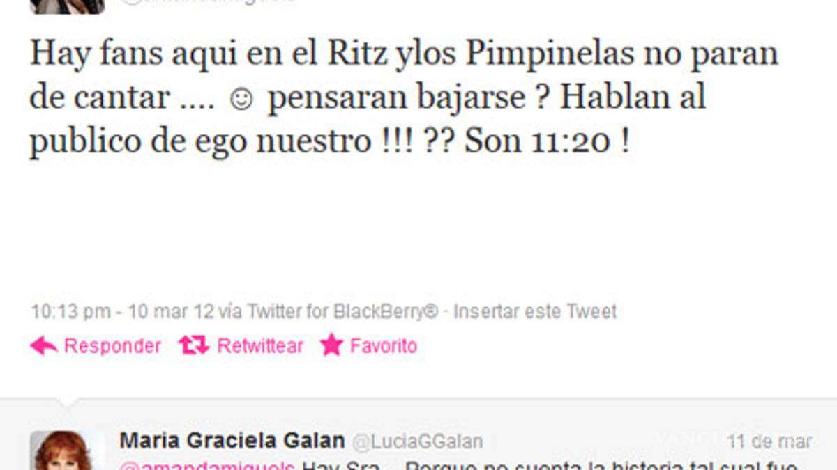 Amanda Miguel acusó a Pimpinela de querer acapararse el show y no hacer el pase en el tiempo establecido. "Q divertido ! Aqui esperando !!! Y Pimpinela no deja de cantar ! Y El empresario donde esta ???", publicó con errores de tipeo en su cuenta de Twitter.