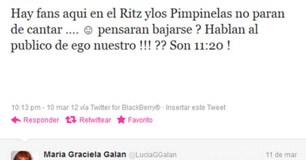 "Hay fans aqui en el Ritz ylos Pimpinelas no paran de cantar .... pensaran bajarse ? Hablan al publico de ego nuestro !!! ?? Son 11:20 !", escribió minutos más tarde.