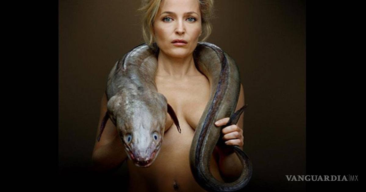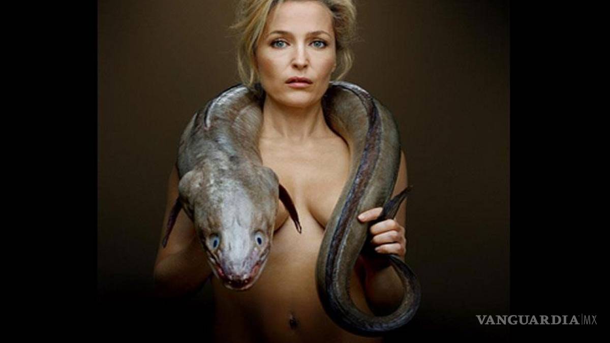 La recordada agente Scully de la exitosa serie de ciencia ficción "Los Expedientes Secretos X" (The X-Files) participó de una particular sesión fotográfica en la que aparece cubriendo sus senos sólo con una anguila.