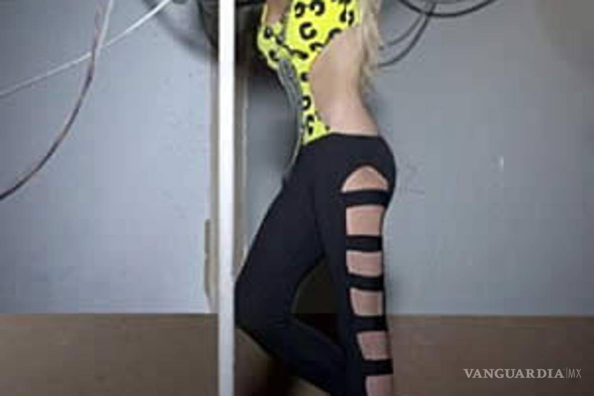 Con un leotardo amarillo y unas mallas negras abiertas de los costados, Lohan aparece en una imagen difundida posando de pie tomando un tubo con la mano.