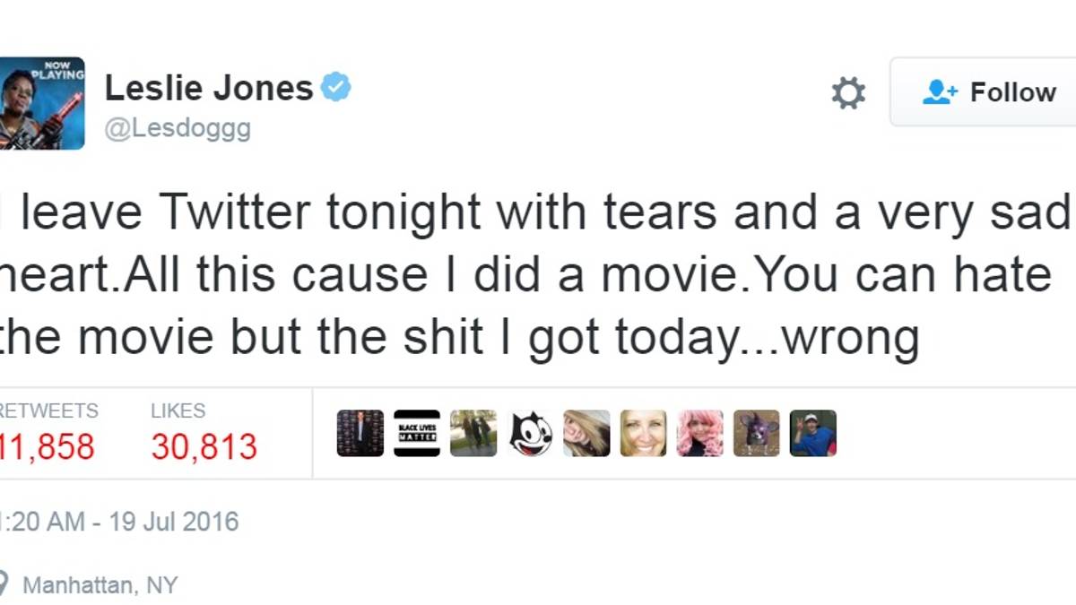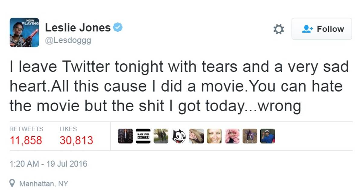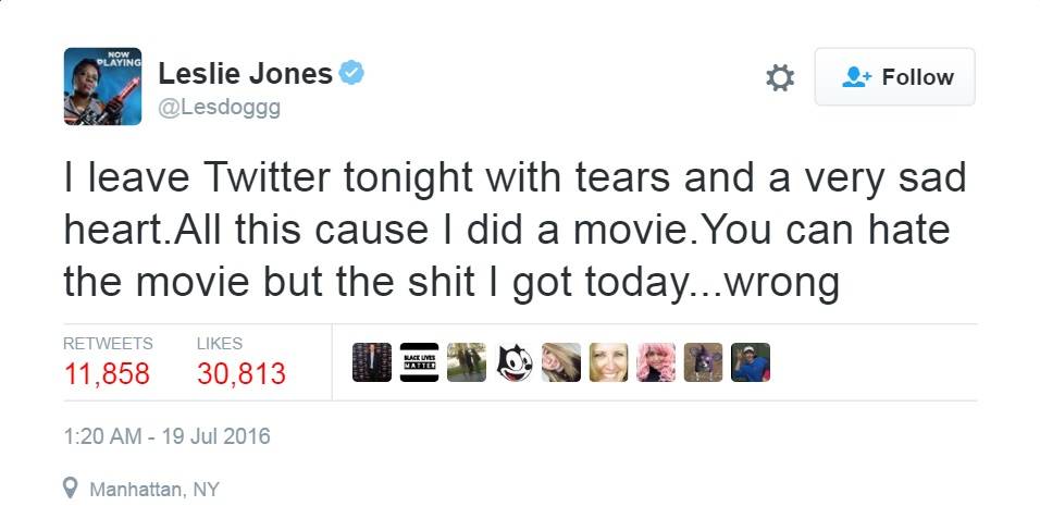 Se trata de Leslie Jones, una comediante de “Saturday Night Live”, que forma parte del nuevo elenco femenino de “Cazafantasmas”, como la única actriz afroamericana de este equipo. Aparentemente, fue su color de piel lo que desató infinidad de insultos en Twitter, por lo que decidió abandonar su cuenta.