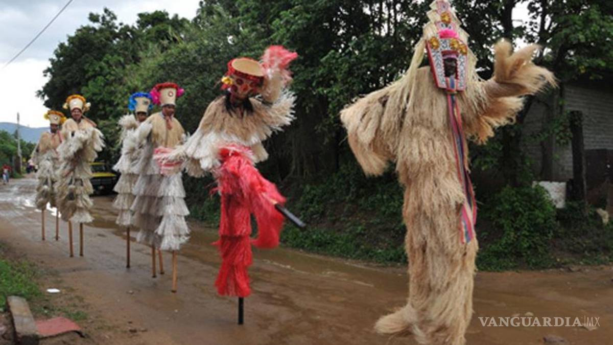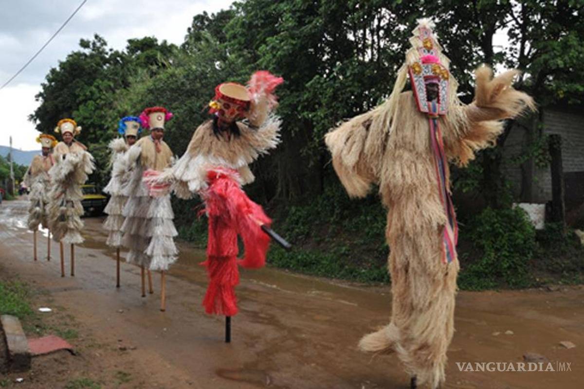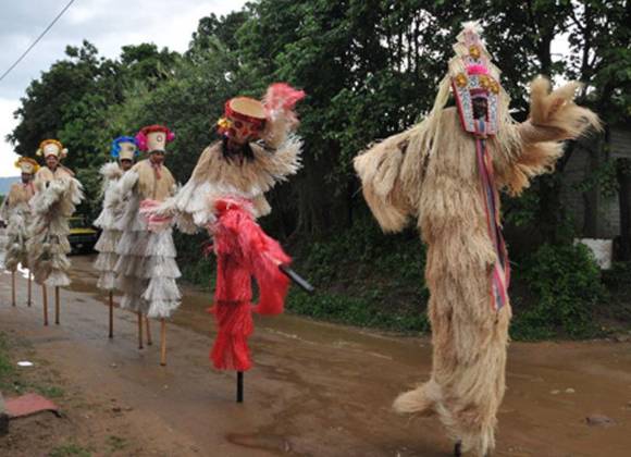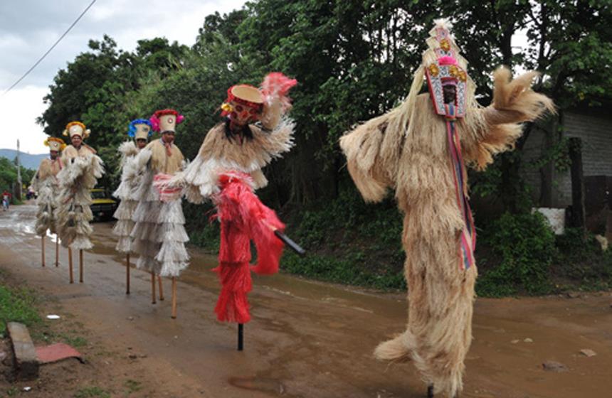 "Según la tradición de Africa occidental los zancos, manos y cabello de los bailarines no deben mostrarse nunca. Así, el artista se transforma en un ser sobrenatural. En Trinidad los zancos se cubren con rafia o se pintan; en Oaxaca se dejan descubiertos".