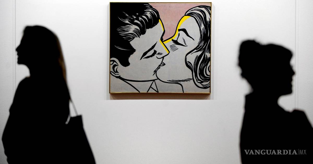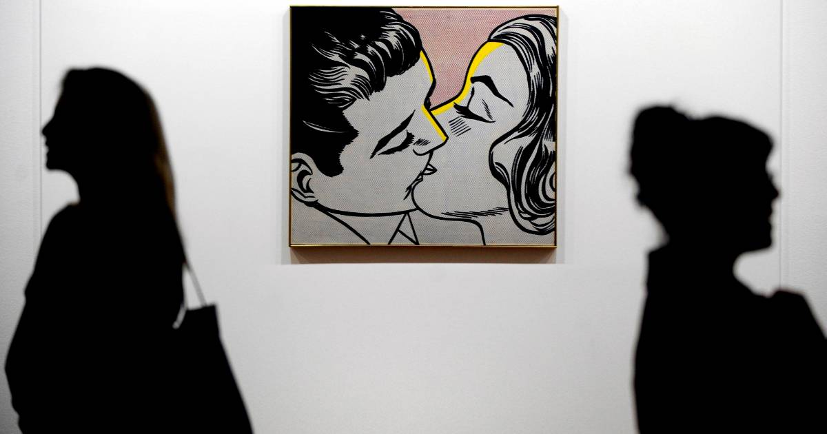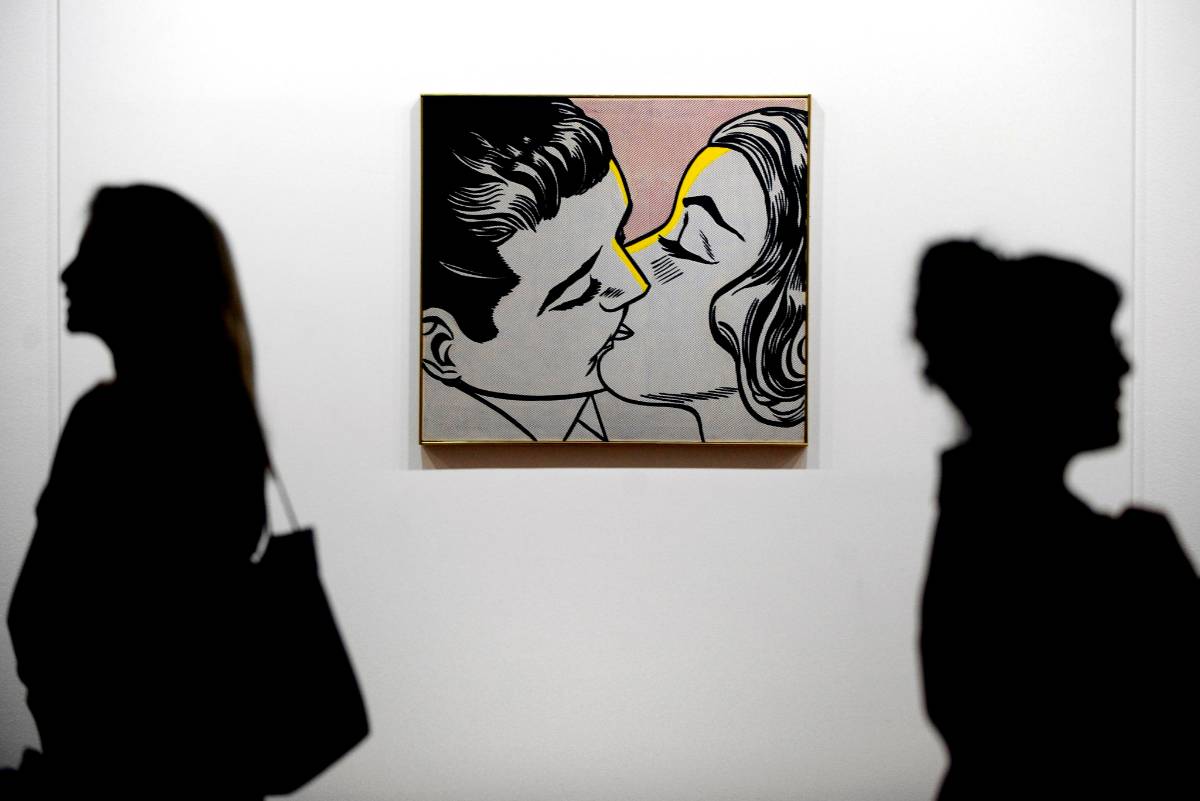 Chagall empleó literalmente la metáfora del “sentirse flotando” del enamorado, así expresó su estado de ánimo “volando como un globo” con su ramo de flores para desinflarse después ante su amada. Llegamos al “Kiss” neoyorquino, Roy Lichtenstein (1923-1997), representante del pop art, y artista que, junto a Warhol, popularizó lo cotidiano en el arte. Sus icónicos dibujos parecen salidos de un cómic con colores fuertes y planos son sus señas de identidad. En su versión de 1963 se apropiaba de la estética de los dibujos animados, pero su estilo, que parecía sencillo, parte de unos planteamientos complejos que él simplificaba.
