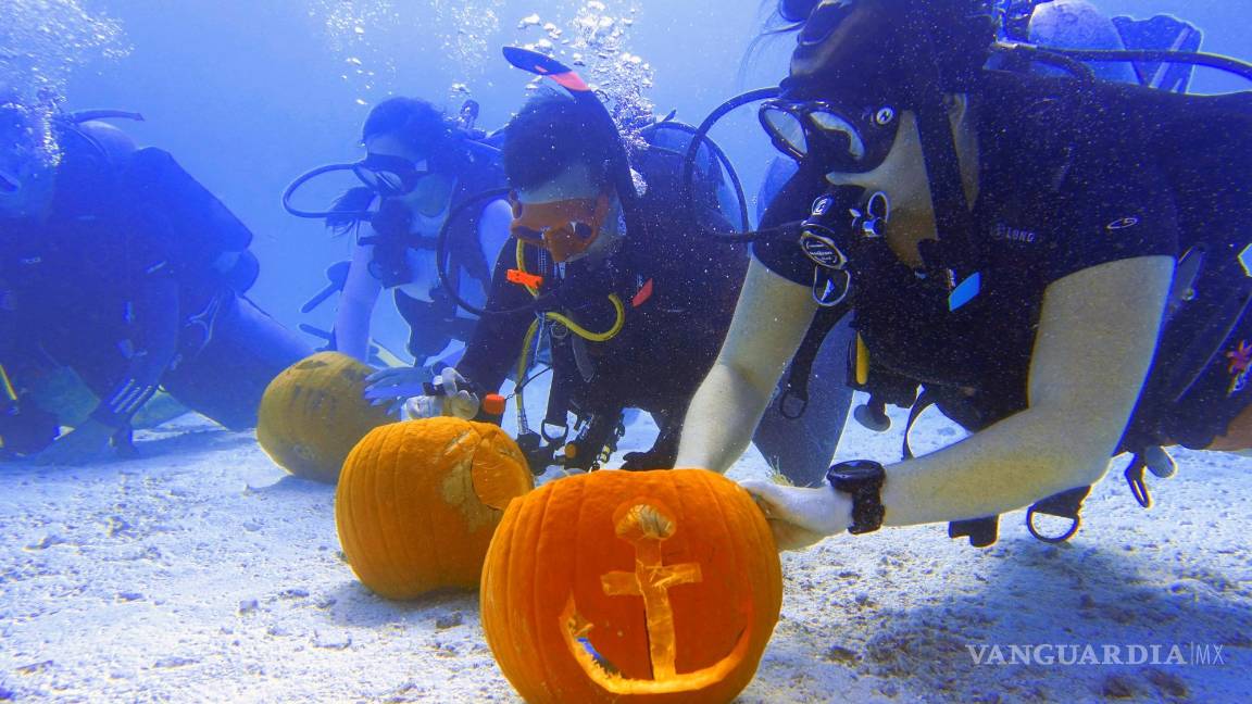 Un grupo de buceadores se sumergió este domingo a unos 30 pies (9.15 metros) dentro de las aguas de los Cayos de la Florida para participar en el concurso anual de tallado de calabazas bajo el agua.