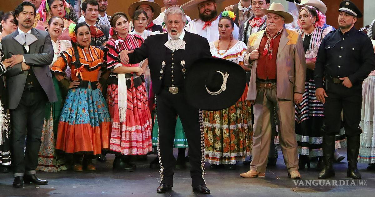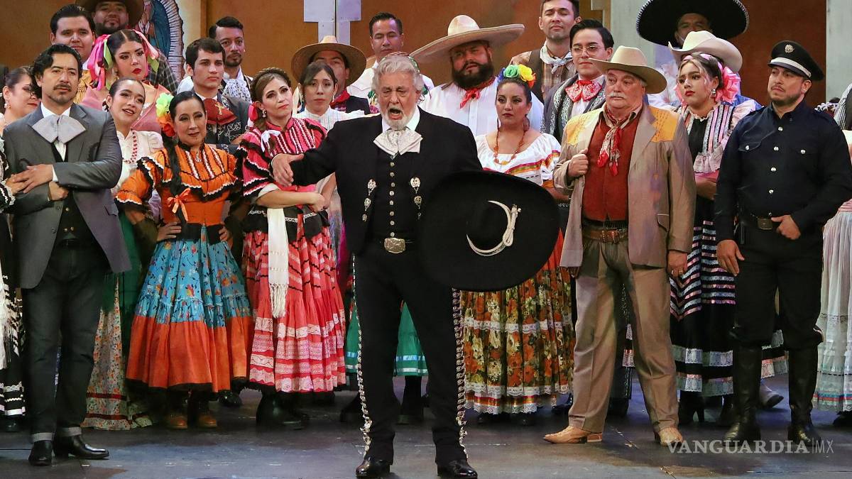 Domingo, invitado de honor al reestreno, subió al escenario vestido de charro para interpretar ‘Ojos tapatíos’, la pieza que cierra la obra, en una estampa tradicional mexicana, rodeado de mariachis y acompañado de la Orquesta Típica y el coro del estado de Jalisco.