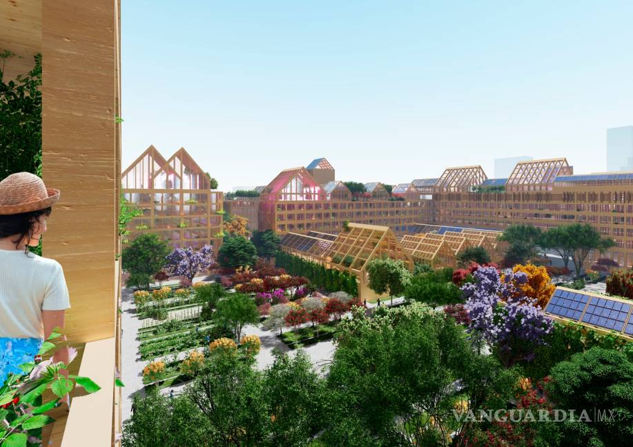 “Asimismo, todos los bloques de viviendas estarán cubiertos por invernaderos que permitirán producir alimentos para el consumo diario y utilizarán sus cubiertas inclinadas para generar energía, al incorporar paneles solares en algunos de sus techos.