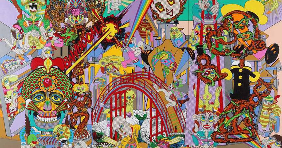 Su estilo se caracteriza por los colores vivos y por combinar imágenes grotescas con elementos de la cultura popular estadounidense o figuras clásicas en el arte japonés, haciendo hincapié en la psicodelia y la novela gráfica.